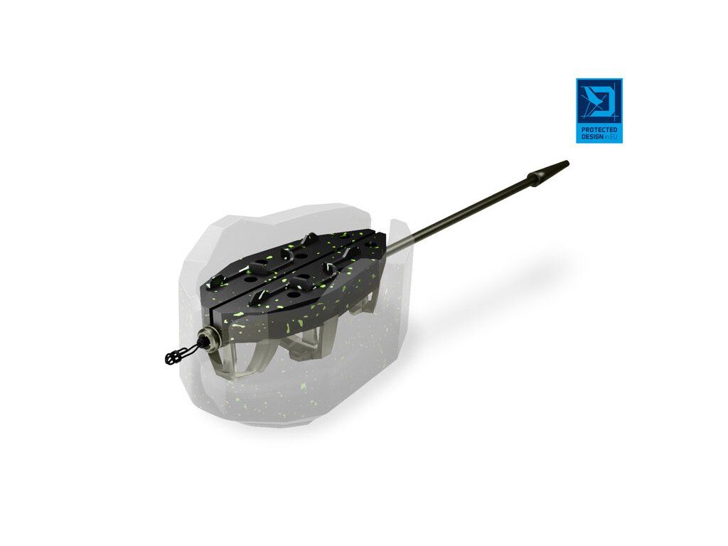 Krmítko Delphin Method QUIX ECO XL je väčšou a ekologickejšou variantnou rybármi obľúbeného modelu Method QUIX. Od pôvodného modelu sa líši najmä dizajnovým prevedením a použitím oceľovej záťaže, vďaka ktorej s ním môžete loviť aj na revíroch, kde je olovo zakázané. QUIX ECO si zachováva všetky najpodstatnejšie prednosti pôvodného modelu, ktoré navrhol vývojový tím značky Delphin. Špecifické tvarovanie rebier zaručuje, že kŕmna zmes alebo pelety pevne držia na tele krmítka aj pri silových hodoch, pričom po dopade na dno dochádza k okamžitému a plynulému uvoľňovaniu návnady. Jednou z hlavných predností modelu XL je jeho veľkosť. Väčšie rozpätie medzi rebrami umožňuje použitie väčších nástrah, čo ho predurčuje na použitie aj pri love veľkých kaprovitých rýb. Tradičné olovené závažie na spodnej strane sme nahradili ekologickou alternatívou, ktorou je v tomto prípade oceľ. Okrem zmeny materiálu prešiel inováciou aj tvar samotnej záťaže. Špeciálne navrhnuté výstupky na spodnej strane zabezpečujú spoľahlivú priľnavosť krmítka na dne a zaručujú, že ostane na tom správnom mieste.Veľkou výhodou je systém rýchlej výmeny, ktorý vďaka vyberateľnej trubičke a vnútornej drážke v krmítku umožňuje zmeniť hmotnosť záťaže v priebehu sekúnd. Stačí vysunúť trubičku a krmítko zložiť z vlasca bez nutnosti zdĺhavého strihania či preväzovania montáže. Aerodynamický profil v kombinácii s predĺženou trubičkou zabezpečí dlhšie a presnejšie hody, zatiaľ čo univerzálny priemer otvoru ochrannej trubičky bez problémov pojme rýchloupínací obratlík. Farebný dizajn v štýle feedrovej série Reaxe s typickým sfarbením dokonale splýva s podvodným prostredím. Súčasťou každého balenia je rýchlovýmenný obratlík s poistkou a gumička proti zamotaniu, čo zaručuje okamžitú pripravenosť krmítka na použitie v rámci vašej koncovej zostavy.