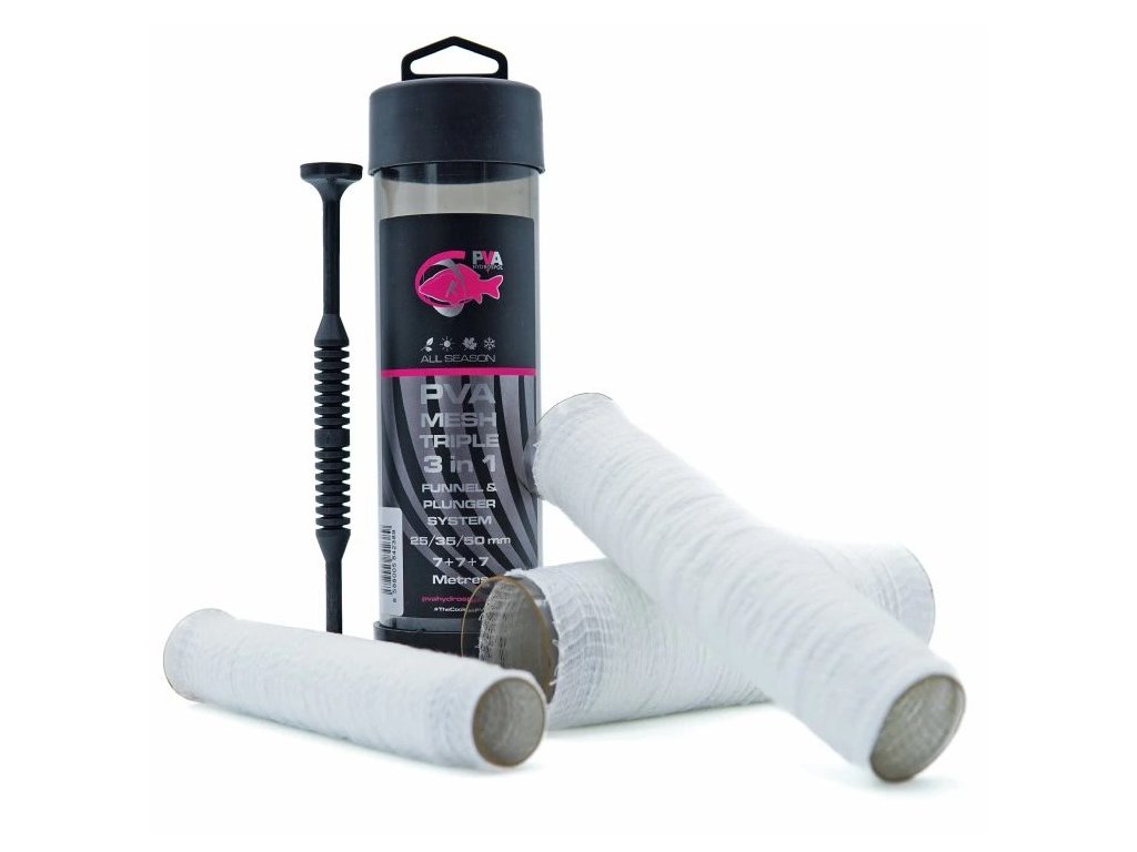 Prvotriedna PVA pančucha vrátane tubusu a utláčača. Európsky výrobca PVA produktov spoločnosť PVA Hydrospol Vám prináša PVA pančuchu 2 v 1 systém 7 + 7m s micro-mesh úpletom 25 mm a 35 mm v jednom tubuse.